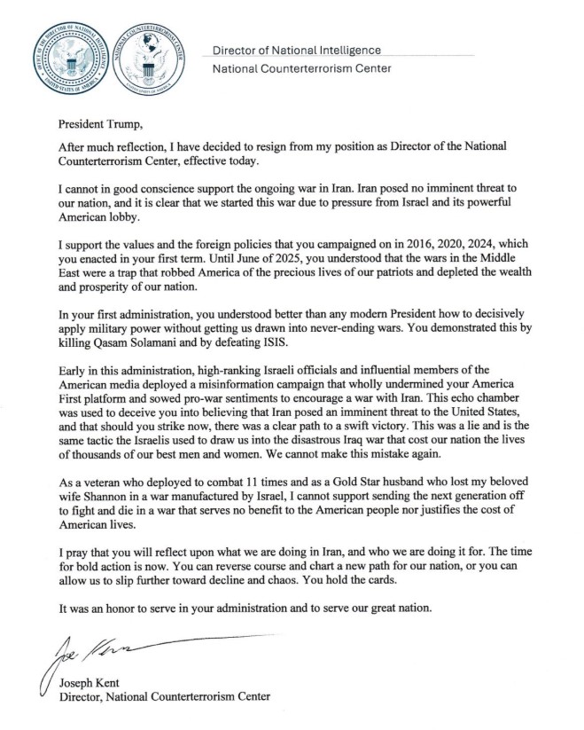 O documento abaixo, a carta pública de renuncia do Diretor do Centro Nacional de Contraterrorismo é um dos documentos mais importantes desde o início das agressões do EUA e Israel contra o Irã, já que vem de dentro do governo Trump, de um até então aliado e questiona os argumentos centrais para justificar os ataques estadunidenses: “o Irã representava uma ameaça iminente aos Estados Unidos e que, se atacássemos agora, haveria um caminho claro para uma vitória rápida. Isso era mentira“